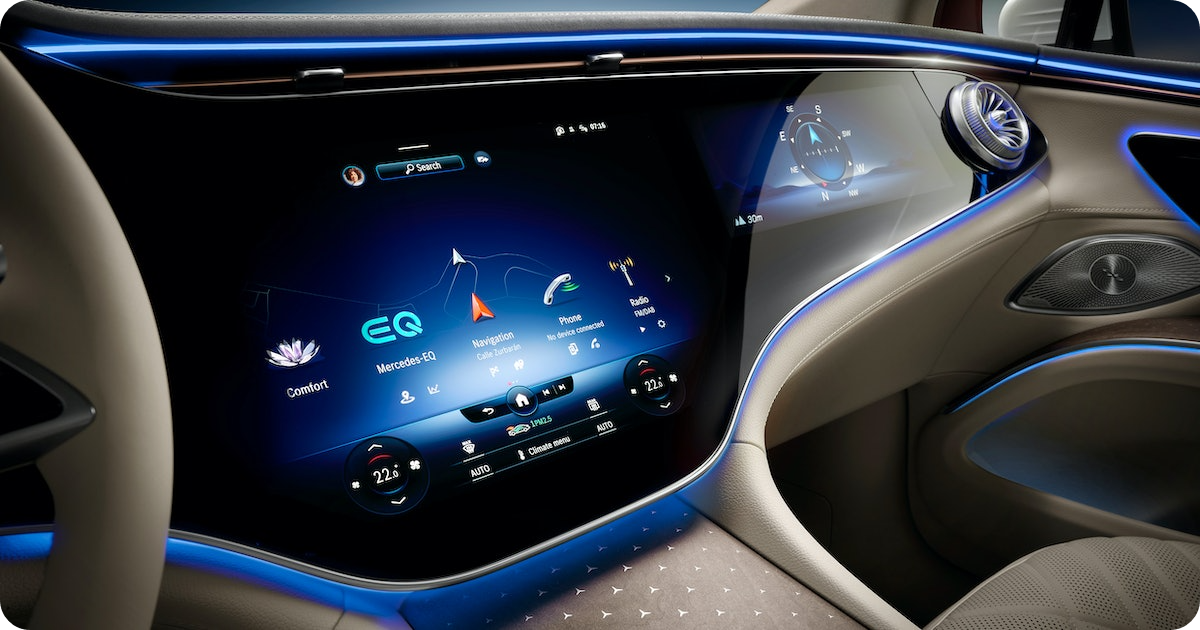 벤츠의 대형 전기 세단 EQS는 운전석과 조수석 앞이 길이 141cm짜리 하이퍼 스크린 디스플레이(54인치)로 덮여 있습니다. 이 디스플레이는 총 3개로, 운전자는 이 화면으로 차량의 각종 기능을 제어할 수 있고, 조수석에선 사진, 영상을 보거나 스도쿠 같은 간단한 게임을 할 수 있습니다.